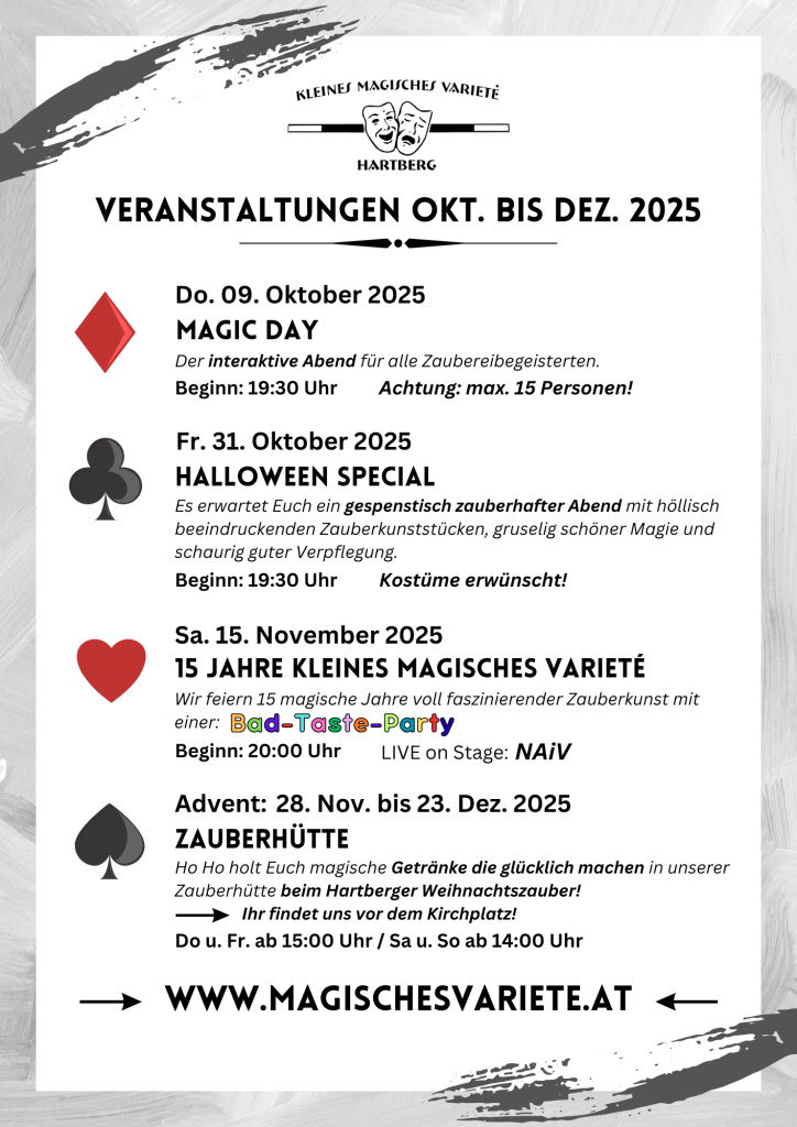Es erwartet Euch ein gespenstisch zauberhafter Abend mit höllisch beeindruckenden Zauberkunststücken, gruselig schöner Magie und schaurig guter Verpflegung